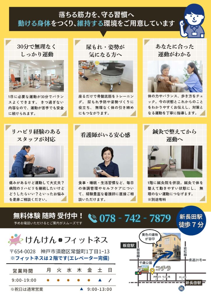 けんけん・フィットネスでは、理学療法士監修のメニューで、無理なく楽しく運動を続けられます。